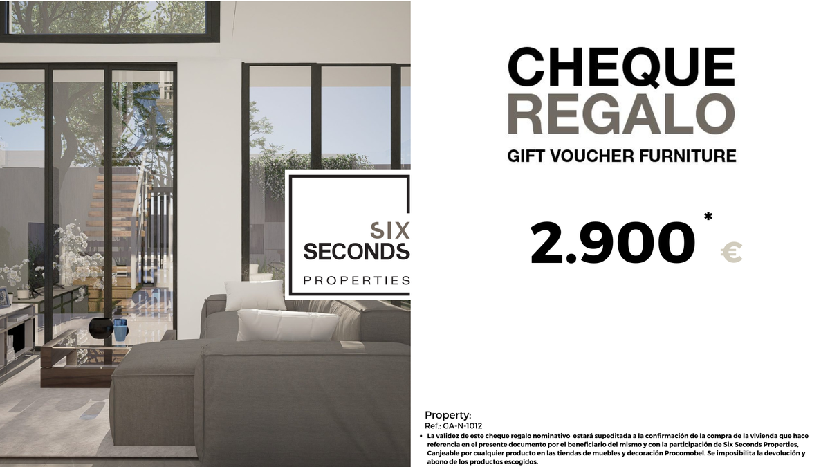 At Six Seconds Properties we help you to turn your new property into the home of your dreams, giving you a gift voucher for furniture in the amount of 2.300 € and a technical visit of the property, where our technical team will advise you on the possibilities of improving the property. Totally free of charge!