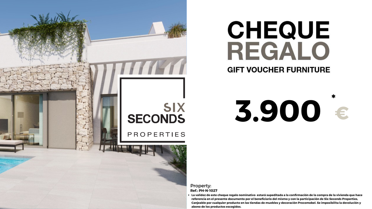 In six   Seconds   Properties we help you turn your new property into the home of your dreams, giving you a gift voucher for € 3,900 in furniture and a technical visit to the home, where our technical team will advise you on the possibilities of home improvement. Totally free!!