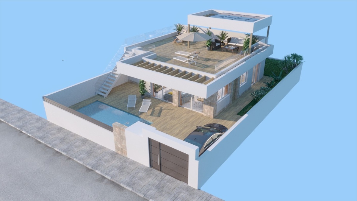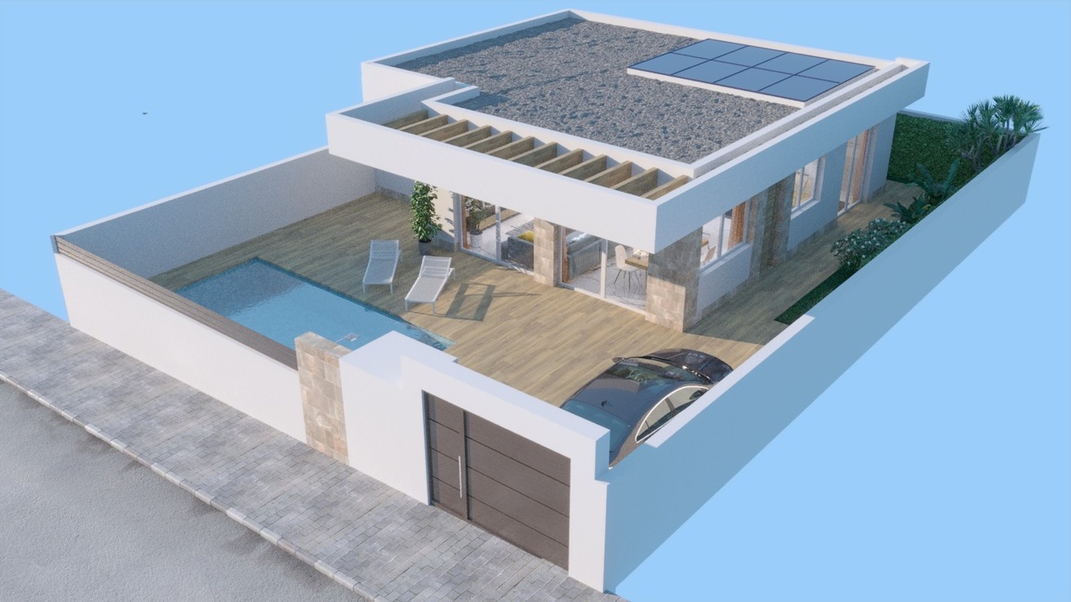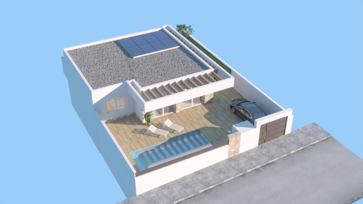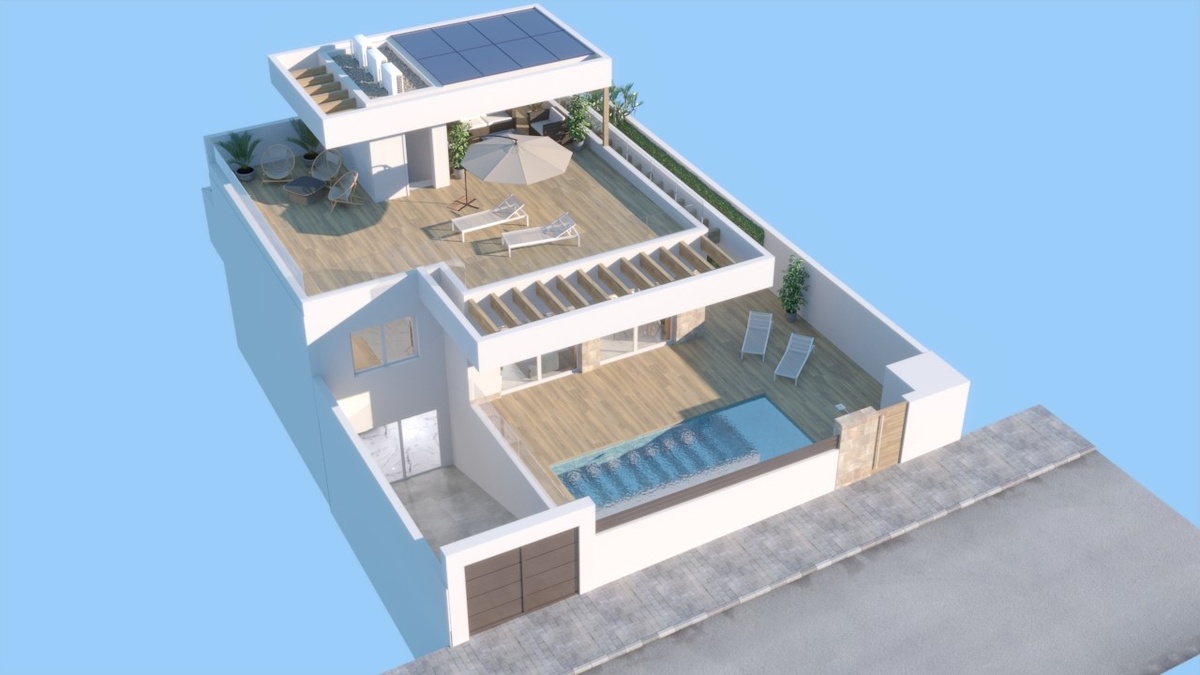This villa has a plot area of 248 m2 and a constructed area of 100 m2. With 3 bedrooms and 2 bathrooms, it includes a 3 x 6 m pool and terraces in the garden and pool area where you can cool off on hot summer days. It has a solarium and a large parking area.