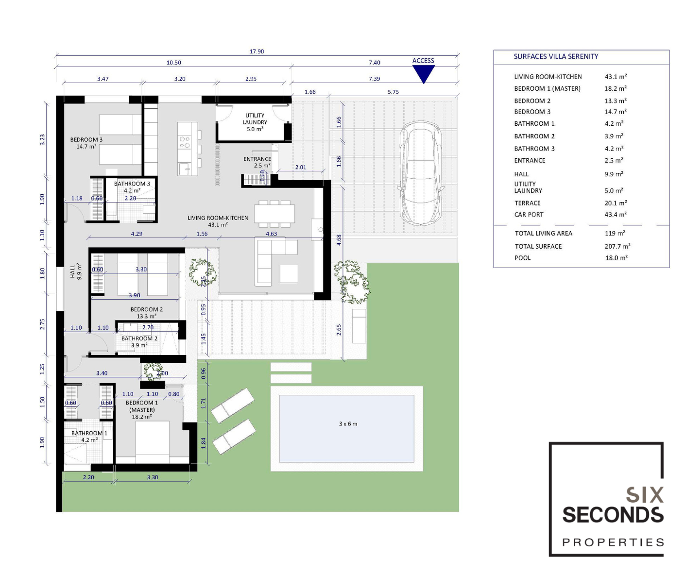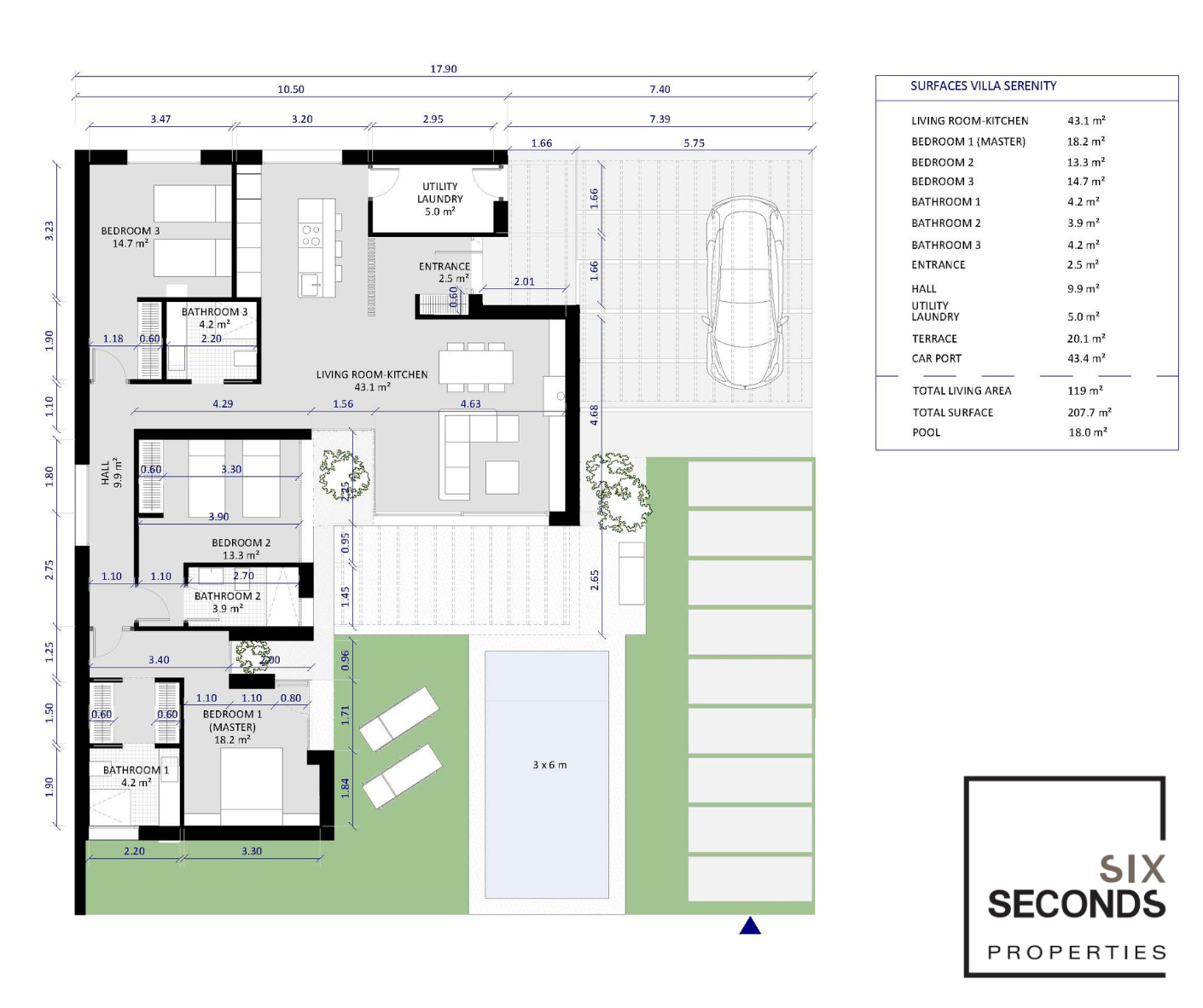 The living space is 119 m² and is designed with elegance and style in mind. The villa features a modern, fully equipped kitchen that integrates seamlessly into the spacious open plan living and dining room. With large windows and sliding glass doors, the villa is flooded with natural light and offers beautiful views of the garden and the peaceful 3x6m private pool.