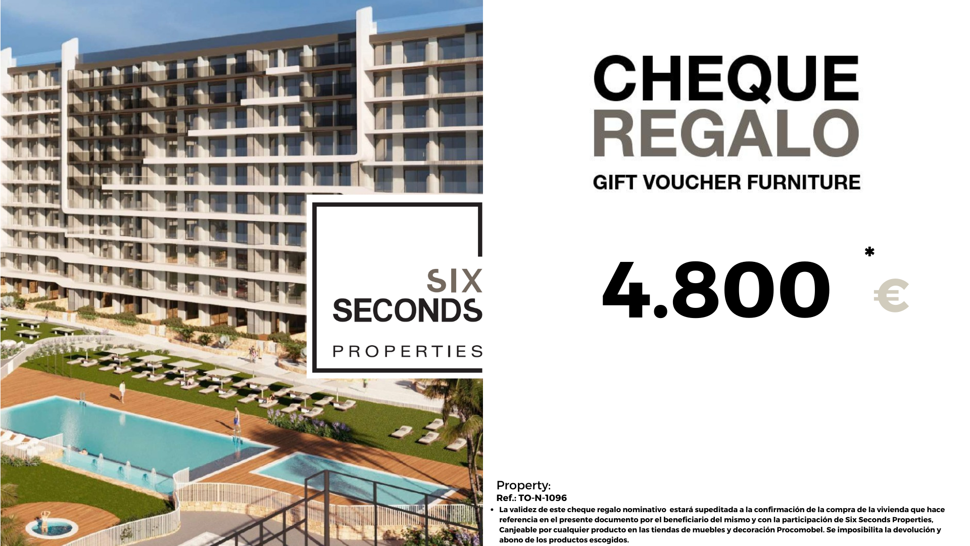 At Six Second Properties (965059685) we help you transform your new home into the home of your dreams by offering you a furniture gift voucher of €4,800 and a technical visit to the home design office where our technical team will guide and advise you on how Improve and decorate your property. Totally free!!