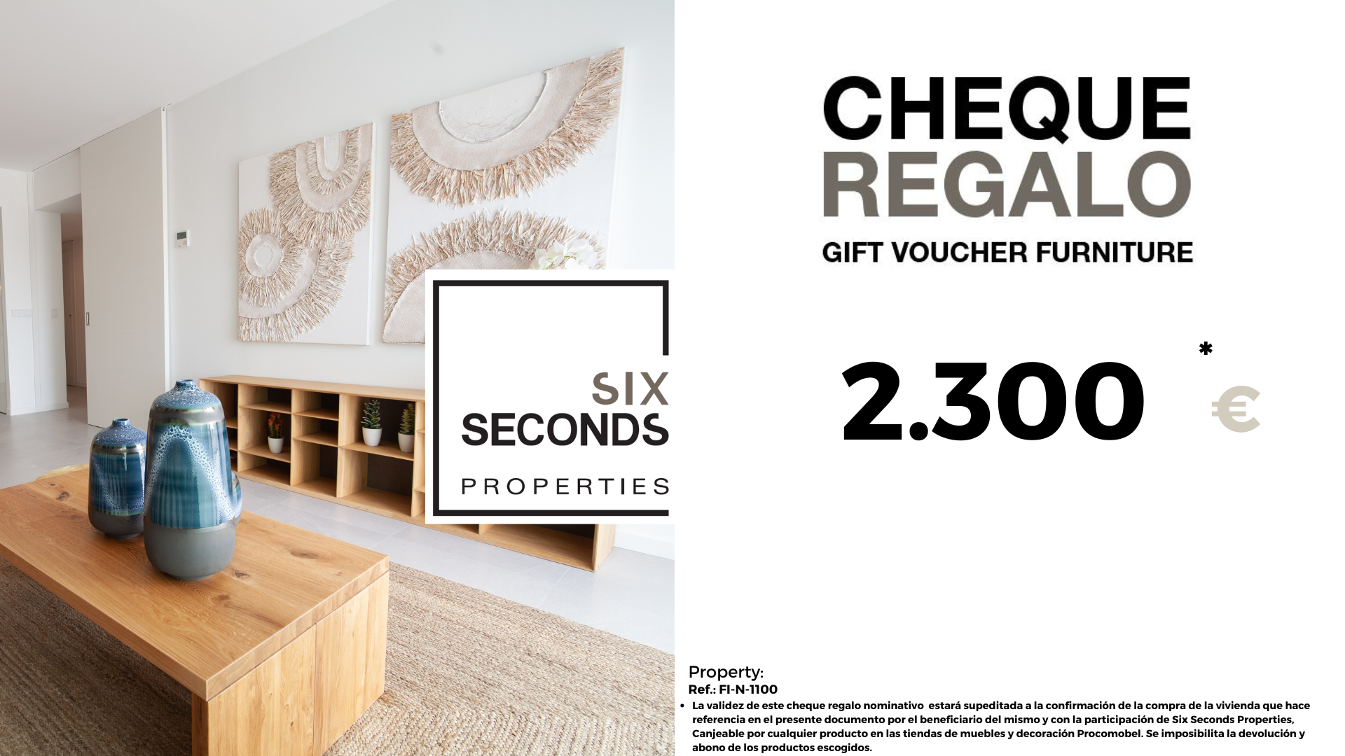 At Six Seconds Properties we help you turn your new property into the home of your dreams , giving you a gift voucher for furniture of 2,300 euros and a technical visit of the home , where our technical team will advise you on the possibilities of improving the home. Totally free!!