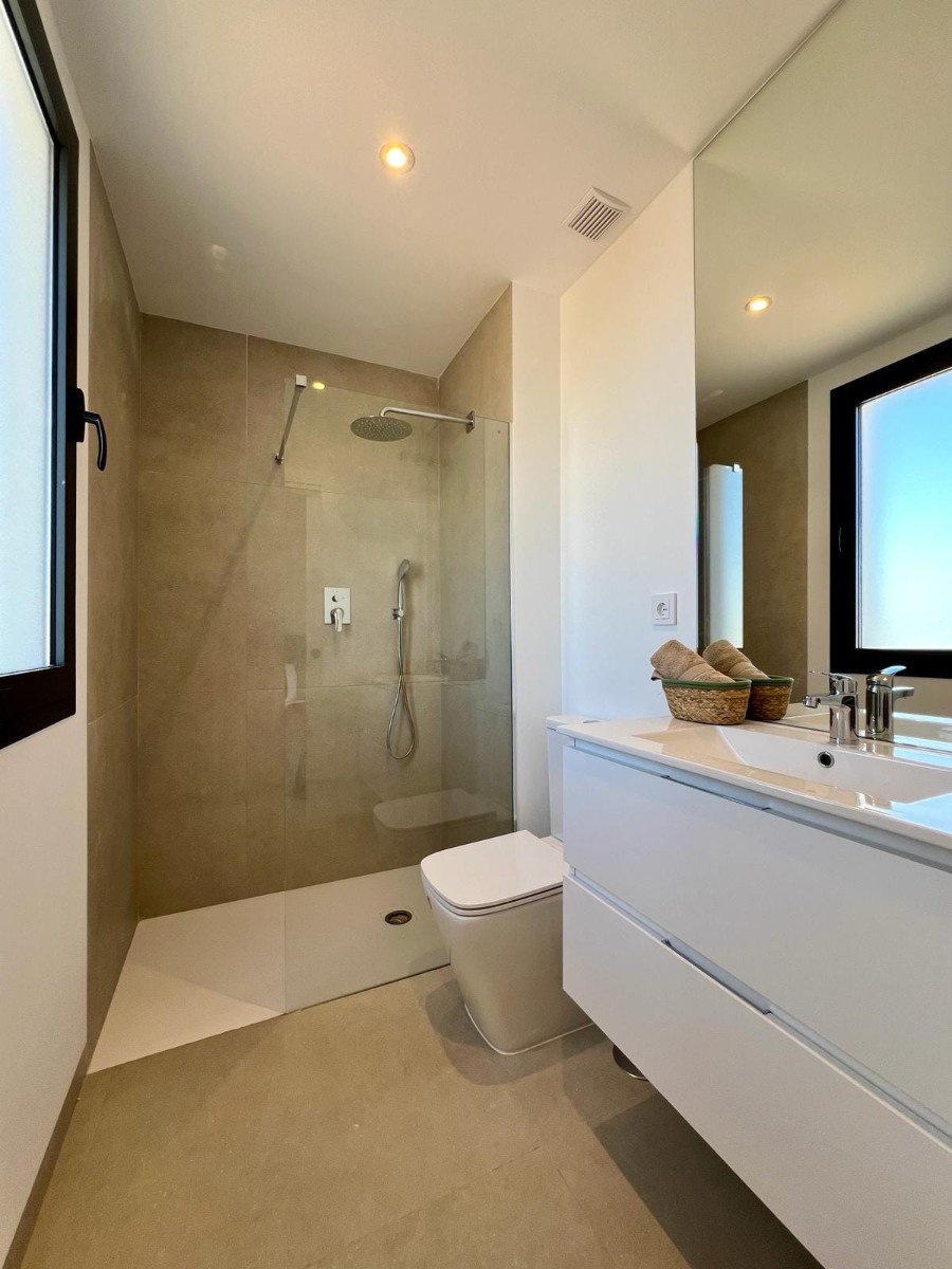 These luxurious 2 or 3 bedroom, 2 bathroom apartments are located just 650 metres from the beaches of Mar De Cristal. Each features a spacious living room that connects to a modern open kitchen and large sliding windows, allowing direct access to the front terrace. From there, beautiful mountain views can be enjoyed, while the penthouses offer fantastic sea views. The price of these properties includes an underground parking space and a storage room, adding convenience and functionality.