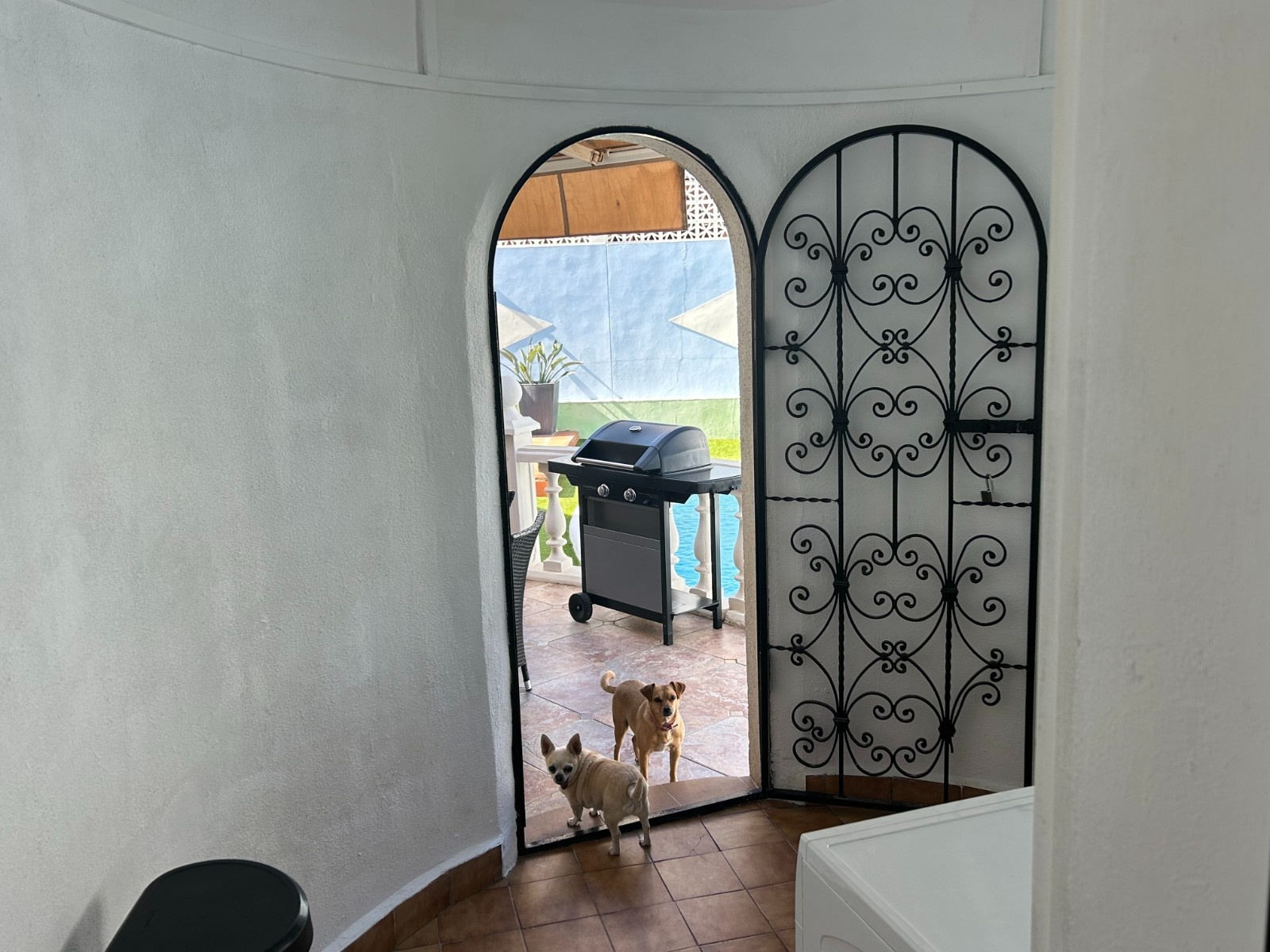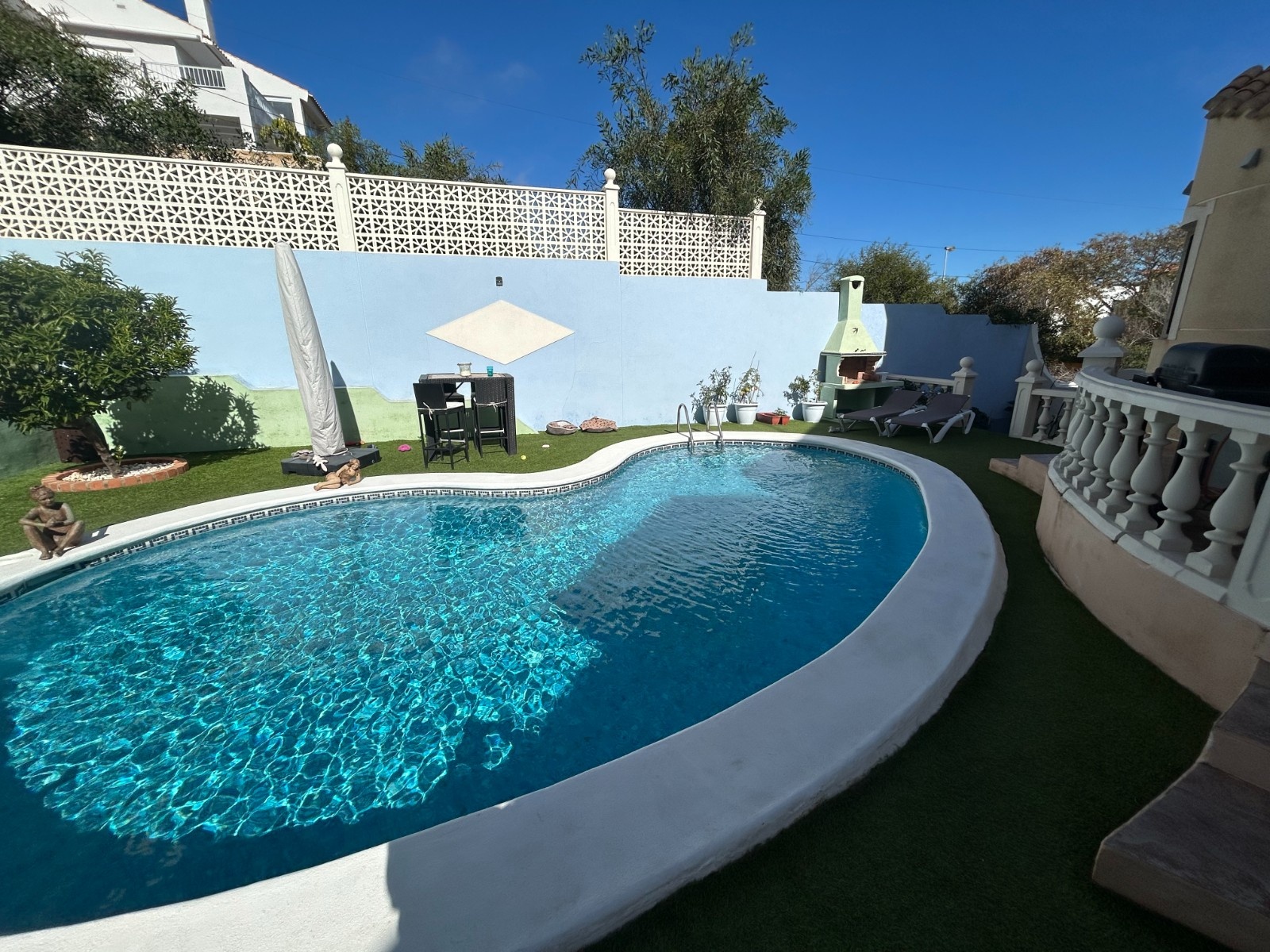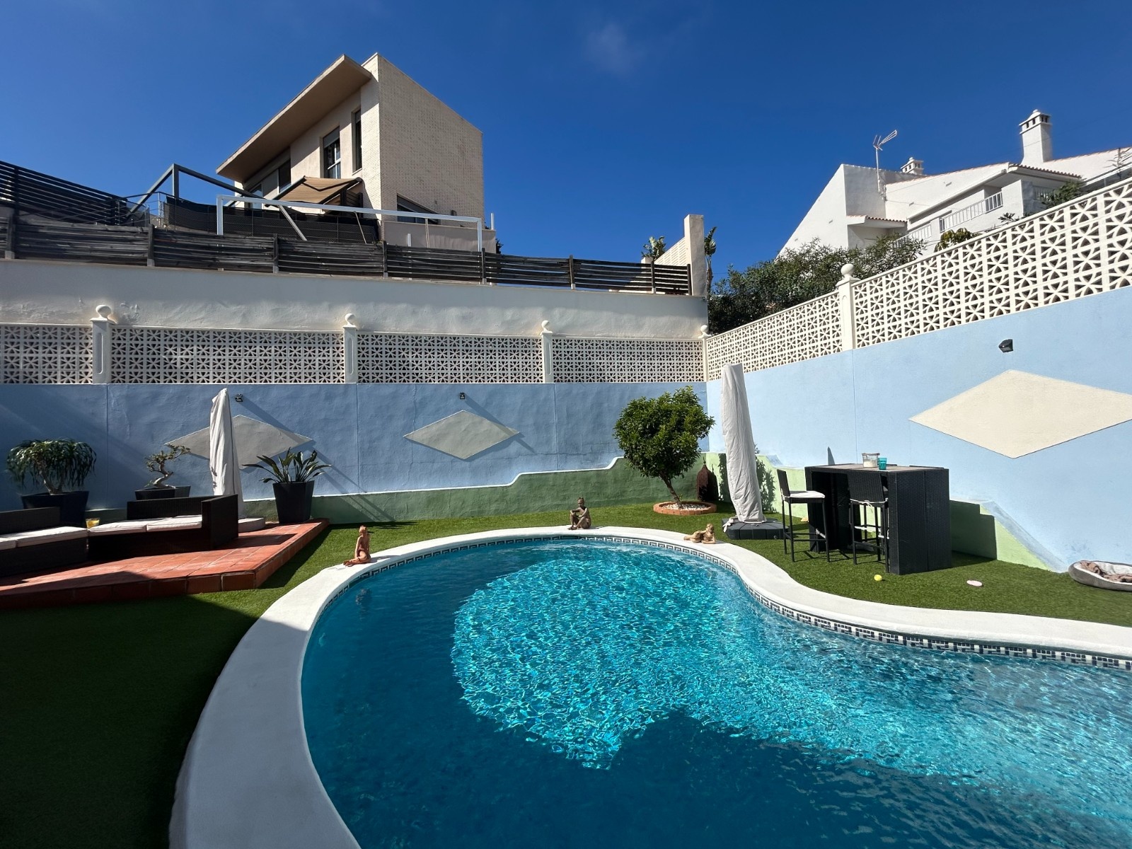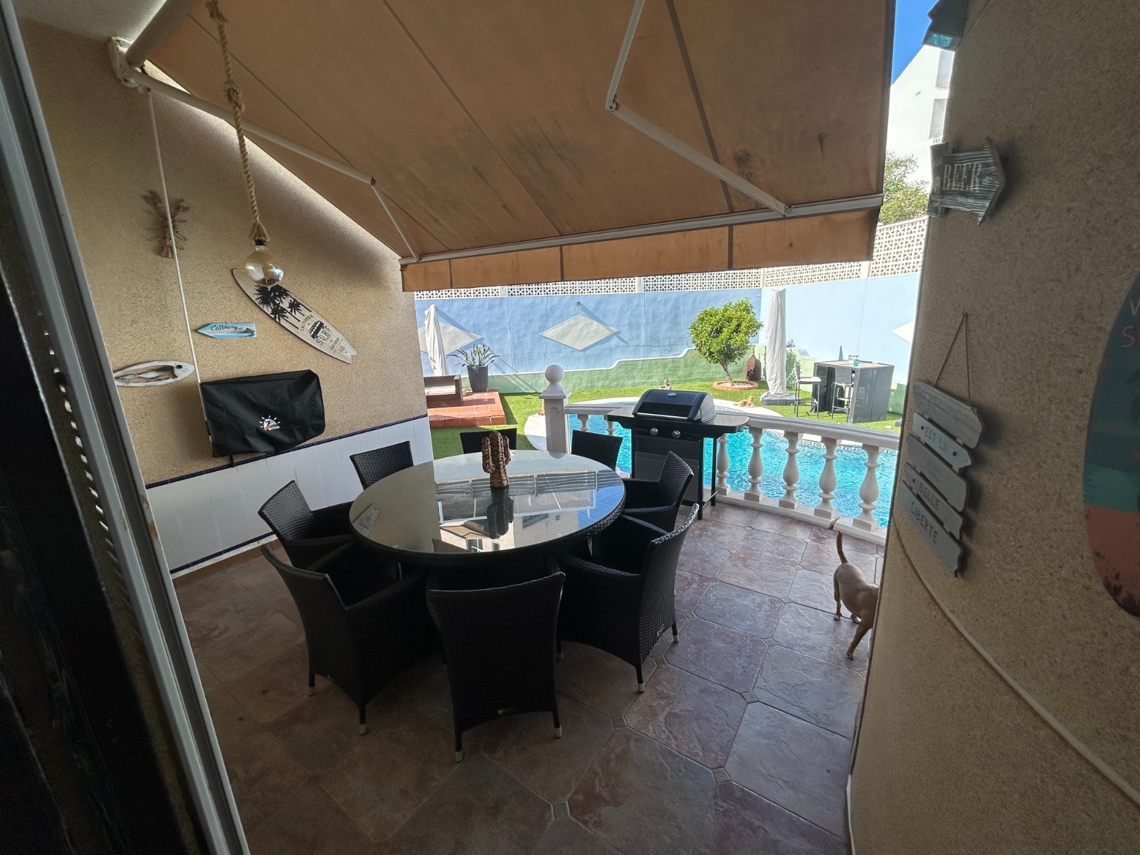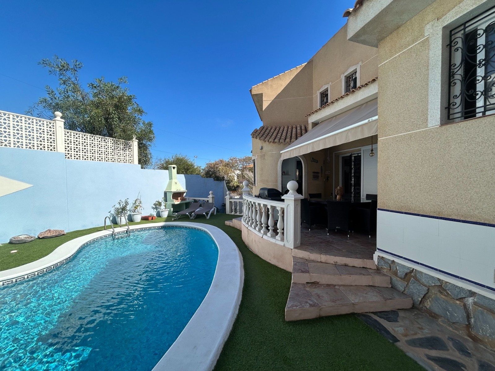 The villa offers a private kidney-shaped swimming pool surrounded by artificial grass, an outdoor shower and a poolside barbecue area, ideal for enjoying the Mediterranean climate. Front and rear terraces create different outdoor environments, while the covered terrace with sun protection is perfect for relaxing at any time of the day.