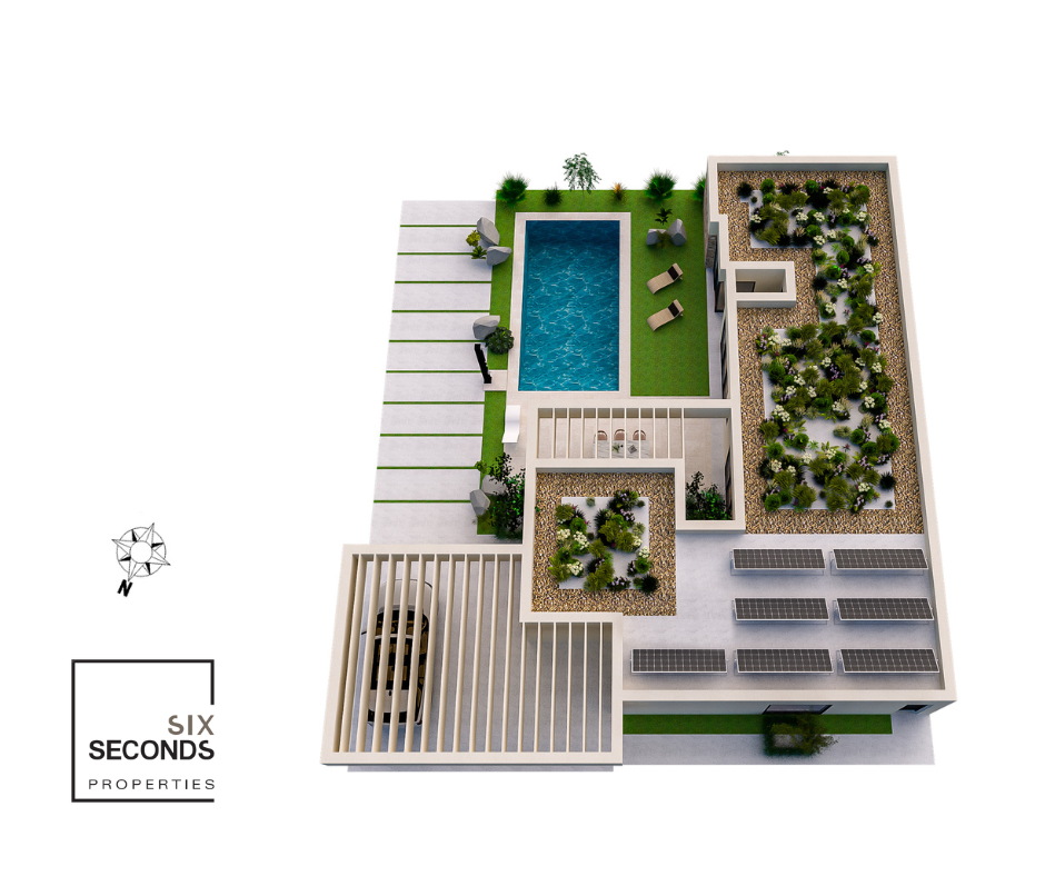 Another distinctive feature of these homes is the efficient use of available space according to Northern European standards. This translates into large rooms and spacious closets. Due to its size, the property offers not only a practical layout, but also maximum privacy from its neighbours, with a spacious living-dining room, modern open kitchen, 3 bedrooms (one of them en suite and with dressing room), two bathrooms, a guest toilet, a laundry room and a hall . In addition, all rooms and areas have been carefully designed to ensure maximum comfort. In the outdoor area we can enjoy the beautiful garden areas, 18 m2 pool and a porch with the possibility of parking a vehicle.
