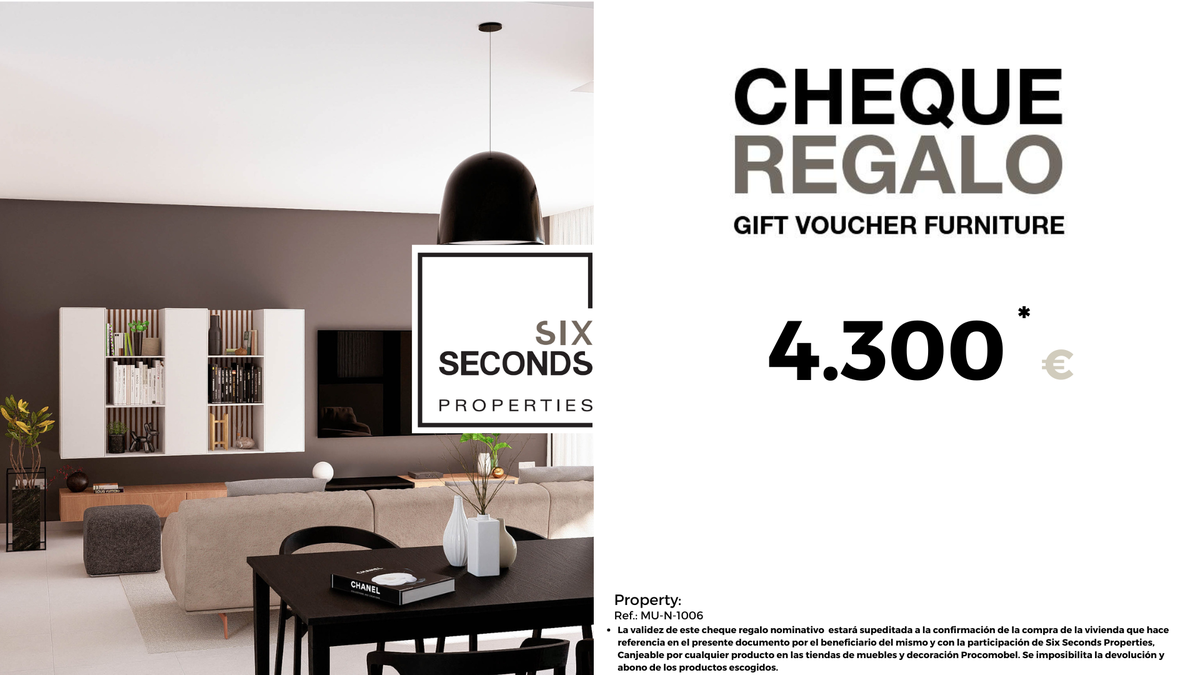 In Six Seconds Properties will help you turn your new property into the home of your dreams, giving you a € 4,300 gift voucher for furniture and a technical visit to the property, where our technical team will advise you on the possibilities of improving the home. Totally free of charge!
