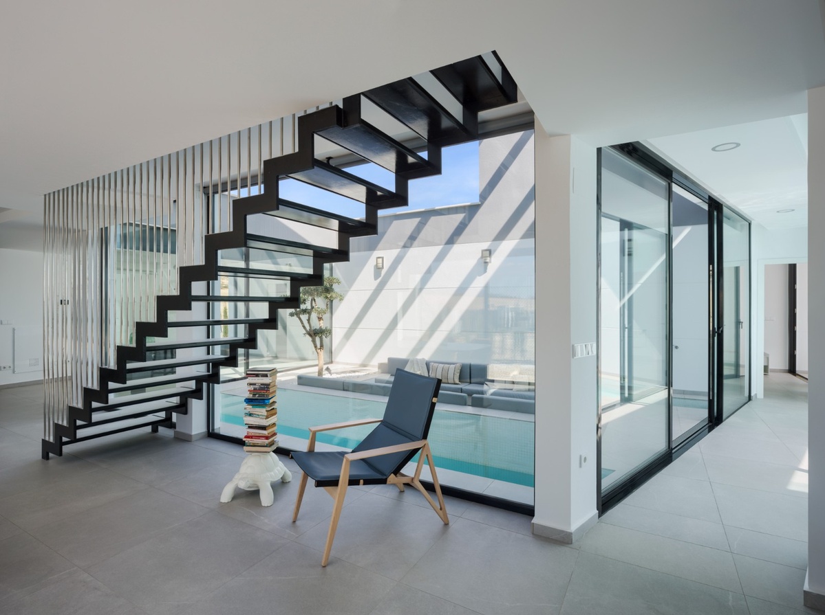 The chill-out area in the main space, surrounded by water that cascades down in the form of a waterfall, is the ideal place for summer gatherings and get-togethers, where you can experience life outside in an exceptional way. A walkway over the waterfall leads to the upper rooms, which look out onto the exuberant exterior.