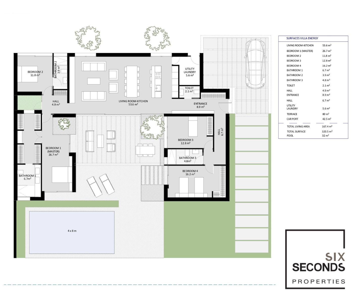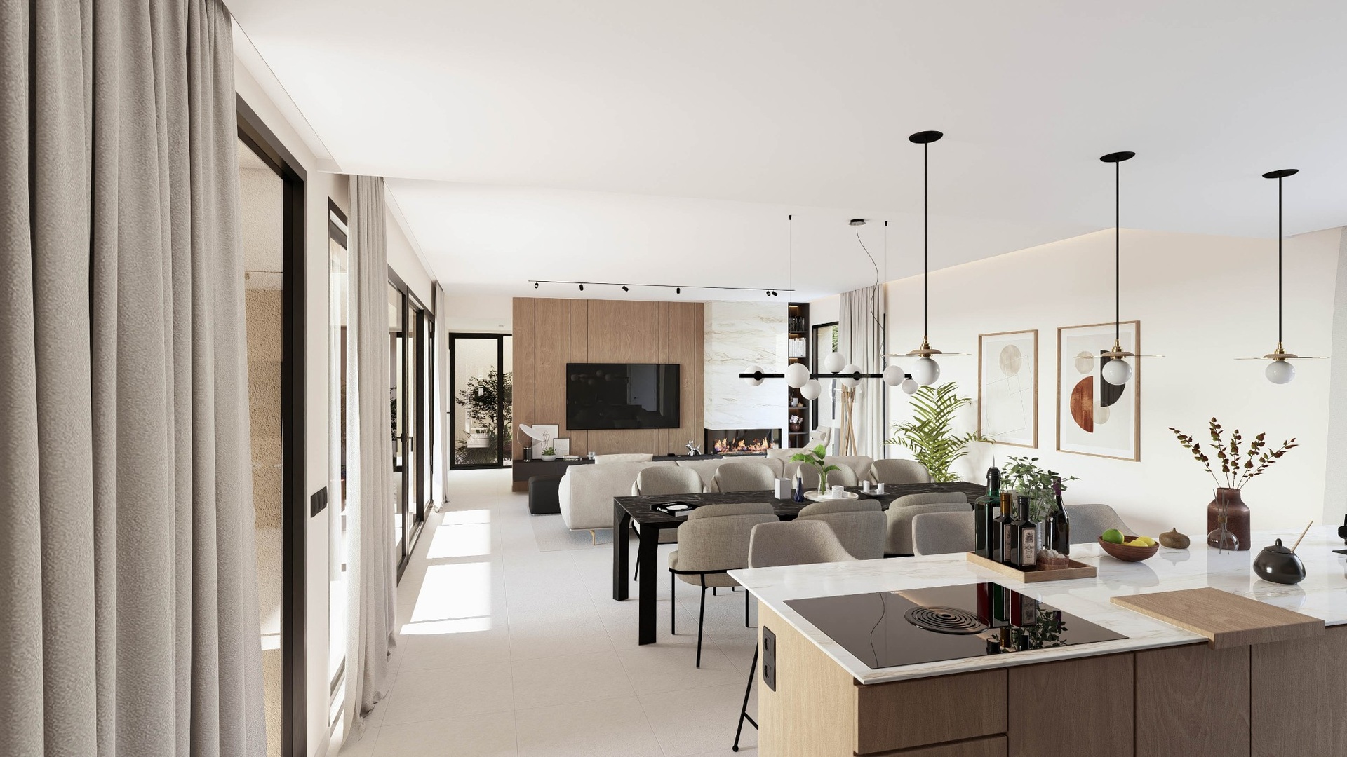 The living space is 164.7m² and is designed with elegance and style in mind. The villa features a modern, fully equipped kitchen that integrates seamlessly into the spacious open plan living and dining room. With large windows and sliding glass doors, the villa is flooded with natural light and offers beautiful views of the garden and the fantastic 4x8 m private pool.
