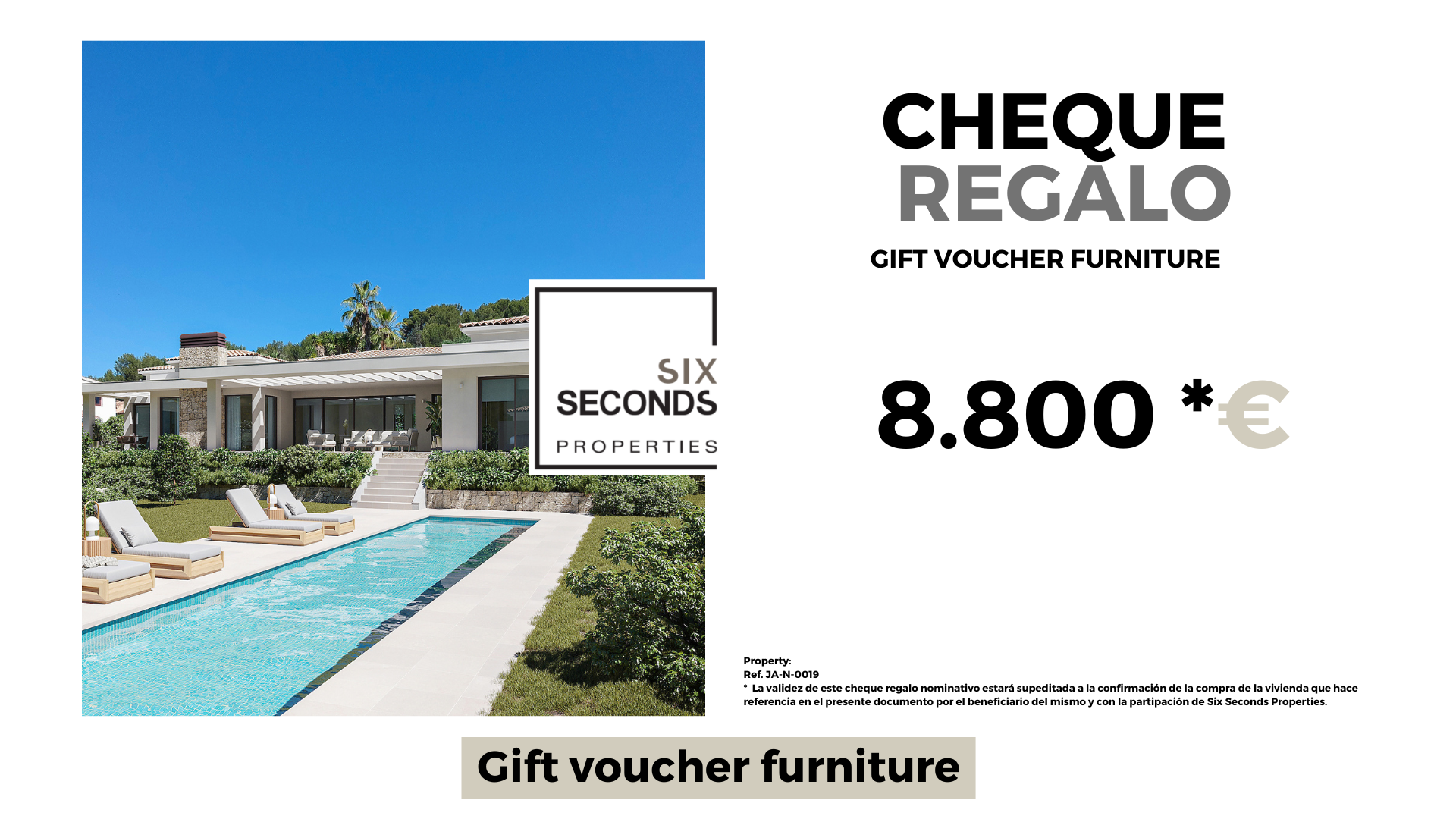 At Six Seconds Properties we help you turn your new property into the house of your dreams, giving you a gift voucher for furniture for an amount of €8,800 and a technical visit from the design department to the home, where our technical team will advise you on the possibilities of improvement and decoration of your property. Totally free!!