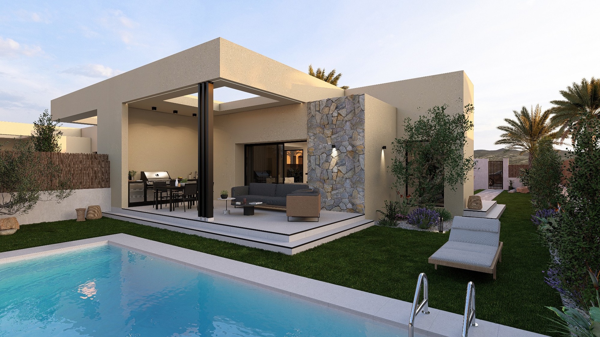 2 bedrooms, 2 bathrooms Private pool Custom garden design with gravel areas and grass planting Drip irrigation system Pedestrian access with video intercom Vehicle access with printed concrete Motorized metal gate with remote control, steel finish, single sliding leaf Fenced land by a wall
