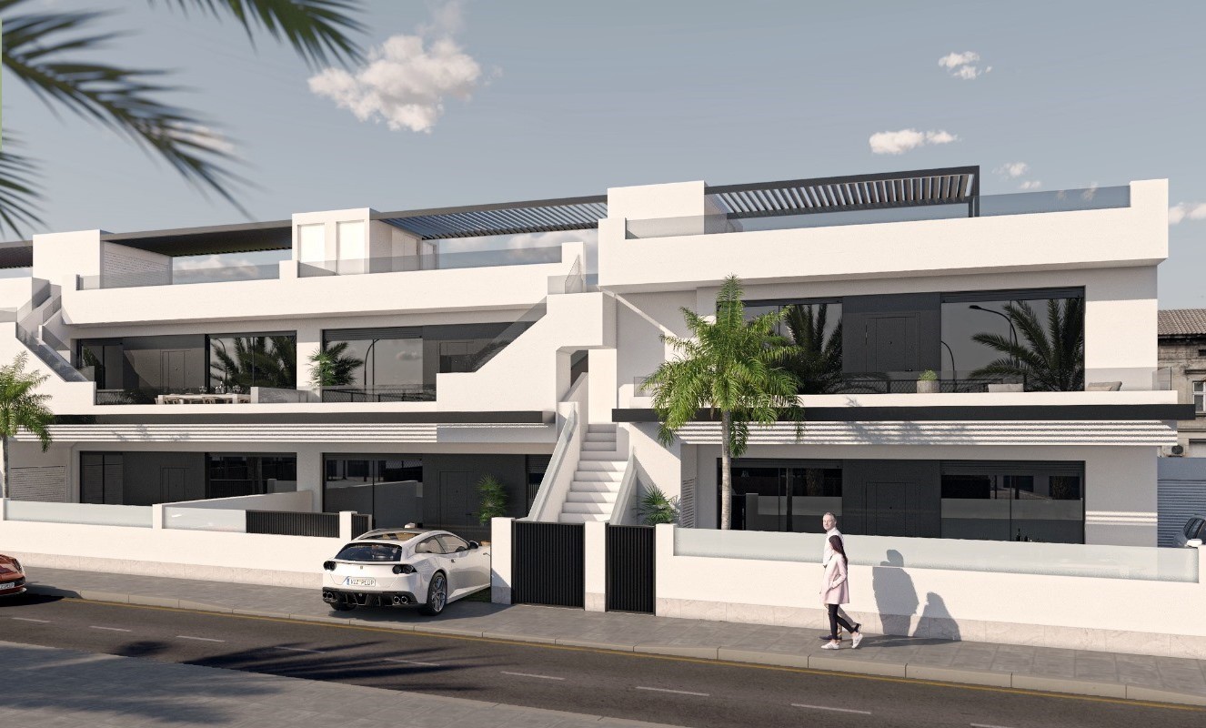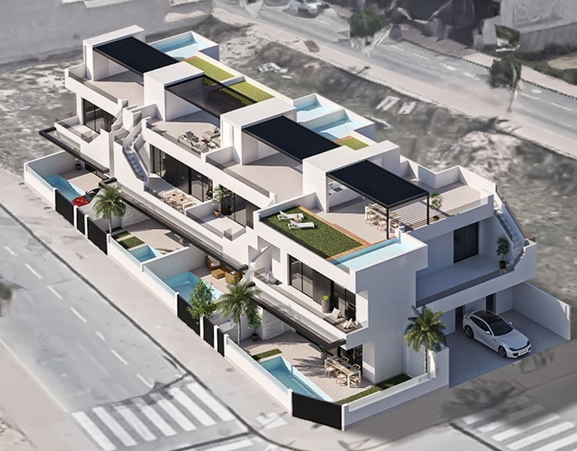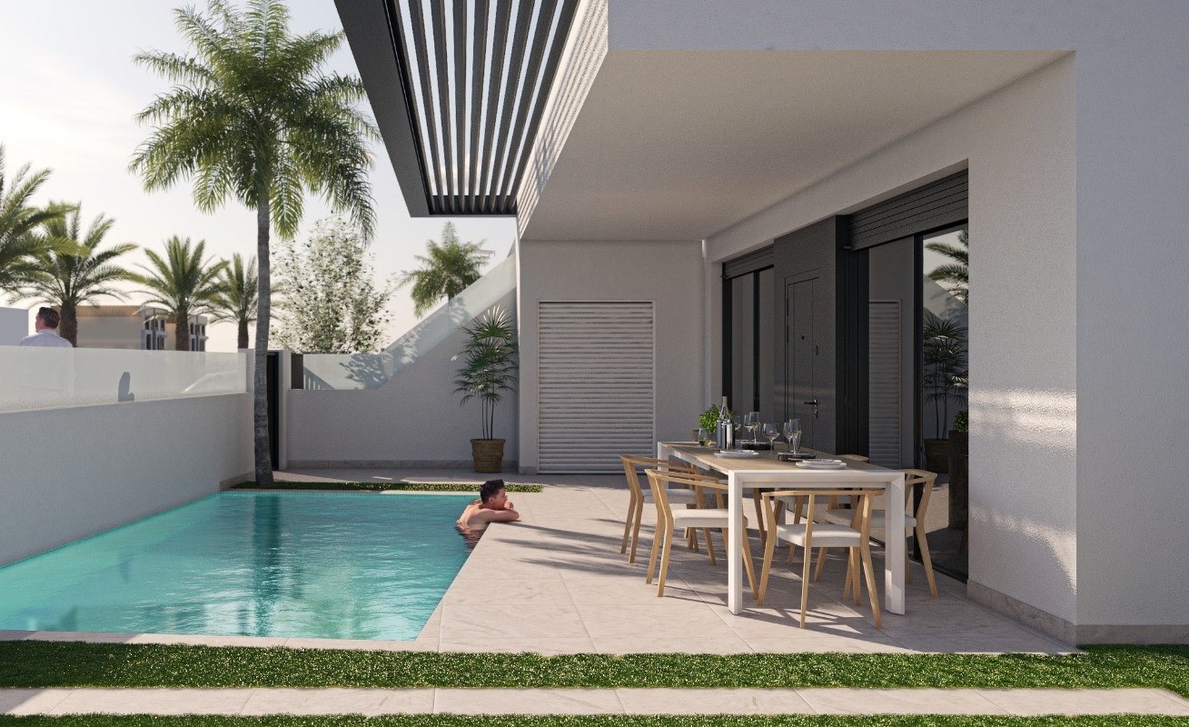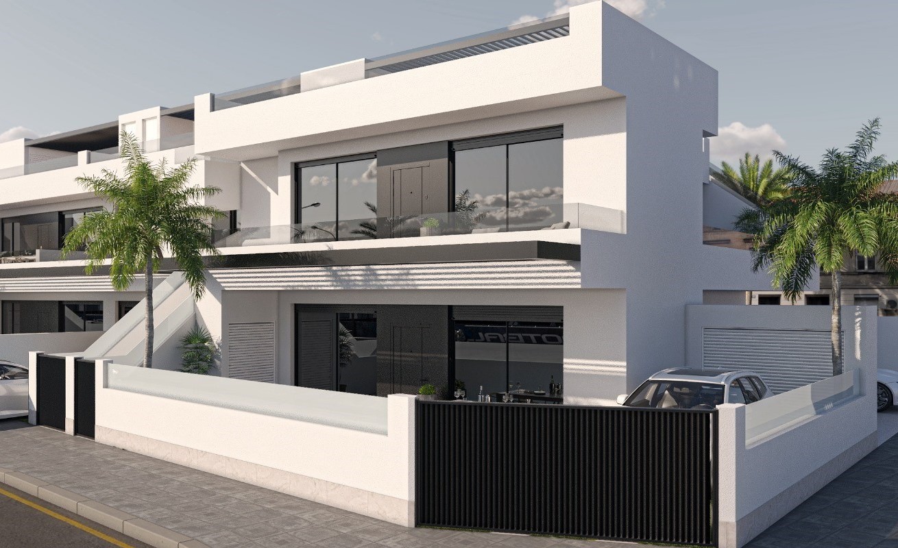 Townhouse for sale in San Pedro del Pinatar, San Pedro del PinatarExclusive property with three bedrooms and two bathrooms, with avant-garde design, offering the perfect combination between elegance and functionality. Enjoy the comfort of your own private oasis with swimming pool, either on the ground floor with a garden or on the upper floor with a terrace and private solarium, equipped with an outdoor kitchen.