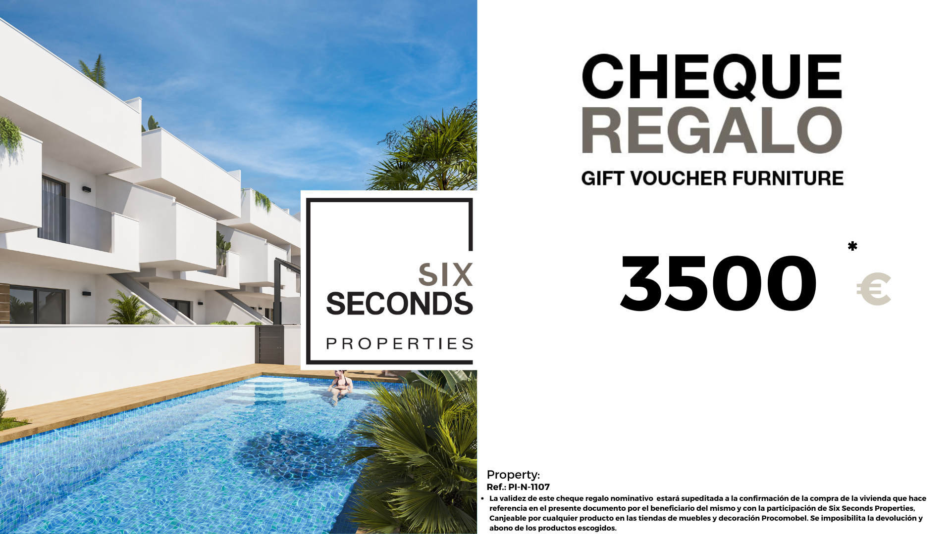 At Six Seconds Properties (965059685), we'll help you turn your new property into the home of your dreams by giving you a € 3,500 furniture gift voucher and a technical visit to the home , where our technical team will advise you on home improvement options. Completely free!
