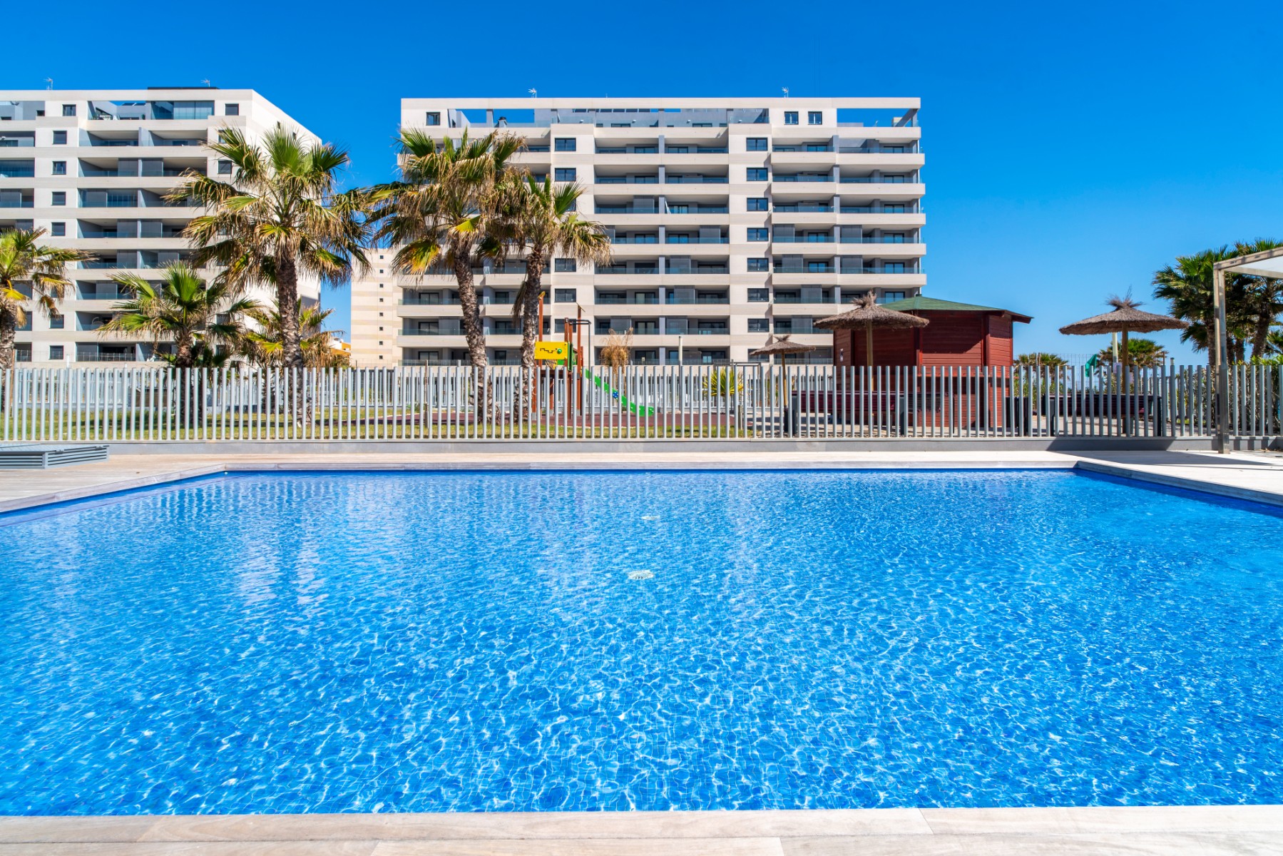 It features built-in wardrobes, is delivered partially furnished, and includes a parking space and storage room for added convenience. The residential complex offers exceptional common areas with swimming pools, gardens, children's play areas, and all amenities within walking distance: the beach, golf courses, shopping centers, and high-end restaurants.