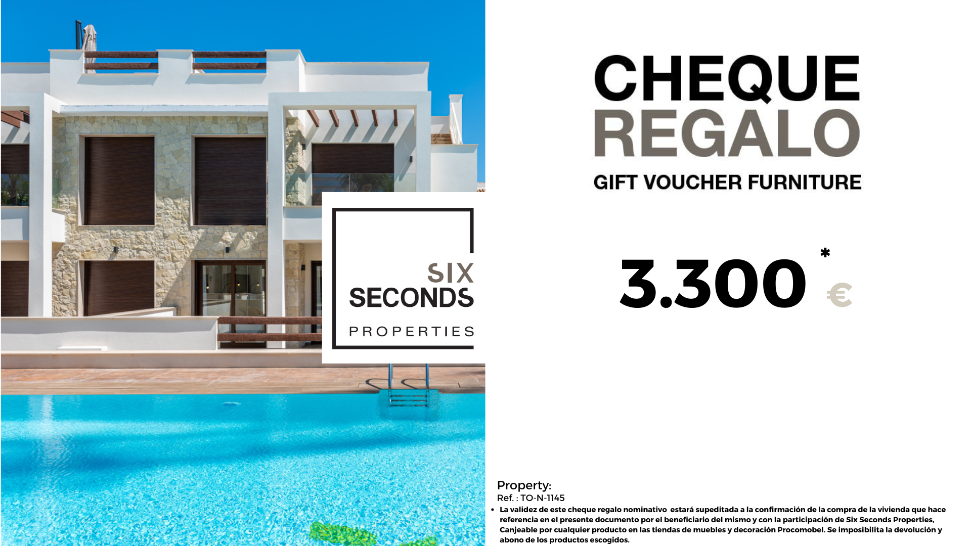 At Six Seconds Properties (965059685) we help you turn your new property into the home of your dreams, giving you a gift voucher worth €3,300 in furniture and a technical visit to the home, where our technical team will advise you on the possibilities of home improvement. Totally free!!