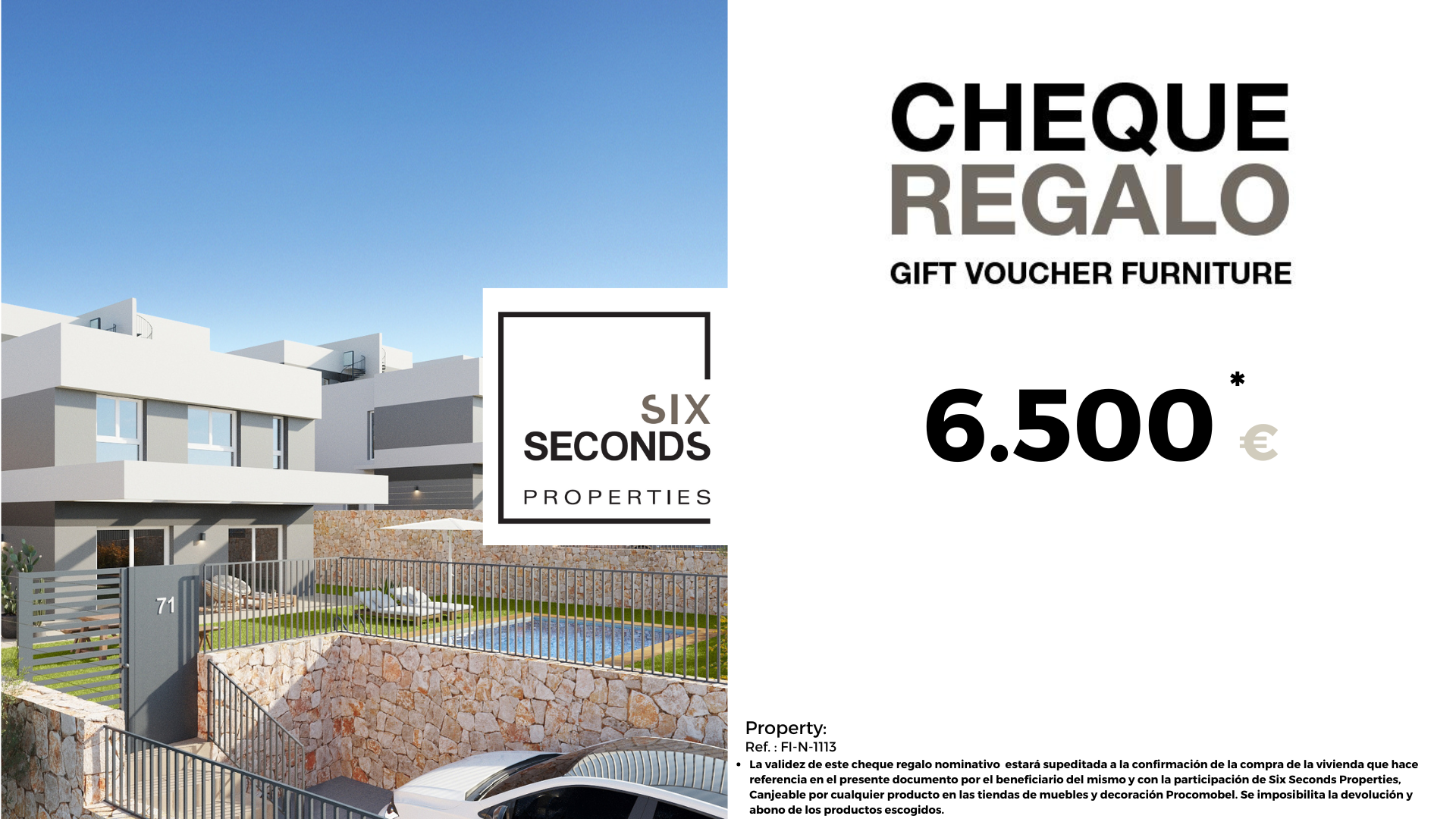 At Six Seconds Properties we help you turn your new property into the home of your dreams, giving you a gift voucher for furniture worth €6,500 and a technical visit to the home, where our technical team will advise you on the possibilities of improving the property. living place. Totally free !!