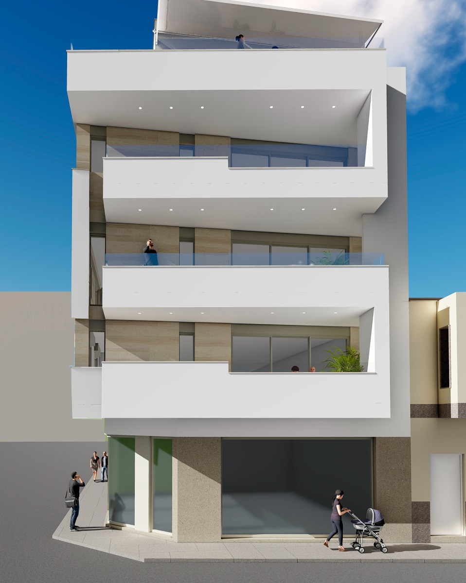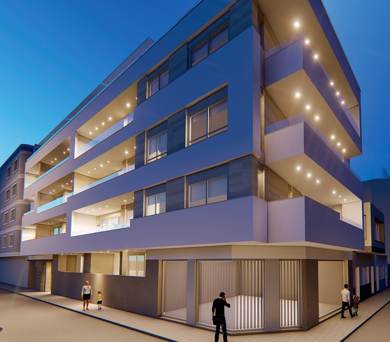 Apartment for sale in Torrevieja, TorreviejaJust 200 meters from Playa del Cura is this new real estate development, a five-story building designed for those seeking comfort and quality of life by the sea. This modern building houses 16 magnificent apartments, ranging in size from 51 to 163 m2, offering one, two, and three-bedroom options, with one or two bathrooms.