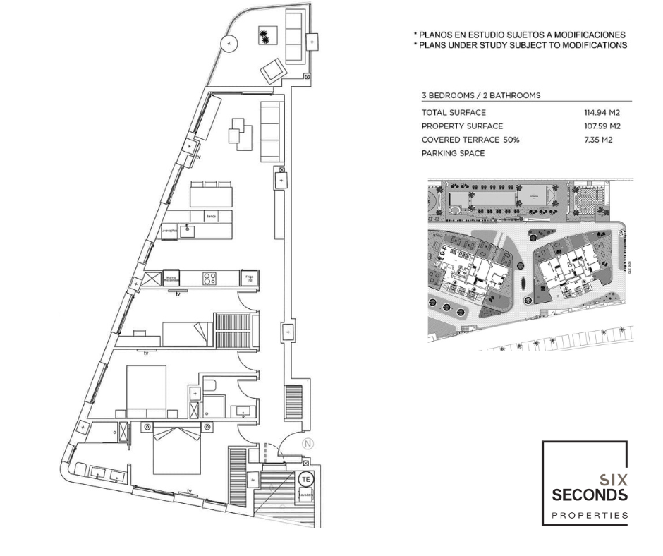 The property has a total area of 114.94 m² , distributed in 107.59 m² of interior surface and 7.35 m² of terrace, perfect for enjoying the impressive views and the sea breeze. The apartment has 3 bedrooms , 2 bathrooms , an open kitchen and a large living area that maximizes space and brightness.