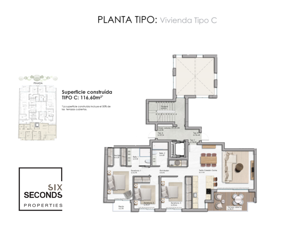 Six Seconds Properties is selling this exclusive apartment. Some homes boast views of the sea and the pine forest. All homes enjoy views of the Mediterranean Sea from their exclusive shared terraces. The development is located in the town of Guardamar del Segura, Alicante . The building enjoys a privileged location, on the border between the town and the pine forest, offering the convenience of living in the center of Guardamar, very close to all amenities, the beach, and excellent connections to Alicante International Airport.